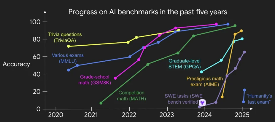 • 即便我们设定更难的基准,很快(而且会越来越快)它们也会被这种套路解决。我的同事杰森·韦伊制作了一张精美的图表,很好地展现了这一趋势: